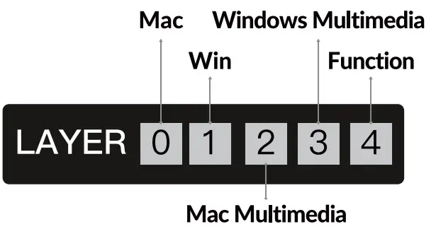 There are five layers of key settings on the keyboard. The layer 0 is for the Mac system. The layer 1 is for the Windows system. The layer 2 is for the Mac Multimedia keys.The layer 3 is for the Windows Multimedia keys. The layer 4 is for the Function keys.