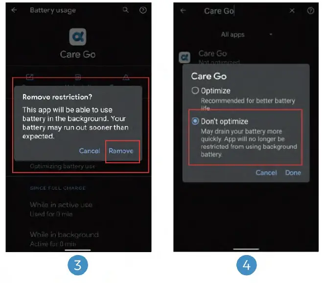 - Select Optimize battery usage – Disable Care Go