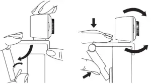 Grasp the webcam in one hand and open the flexible clip base with your other hand. Mount the webcam onto the top of the monitor, making sure that the foot on the flexible clip base is flush with the back of the monitor.