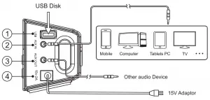 USB Mode: insert the USB disk into the speaker, the speaker will be play MP3 music in the USB automatically.