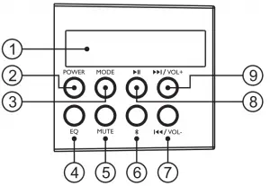 - Mode: Different mode with different display. short press it to change the mode: Bluetooth, line in/USB