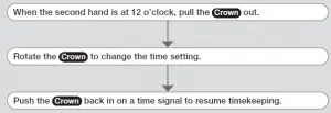- Timekeeping stops while the crown is pulled Correct the current time setting after performing the above operation.