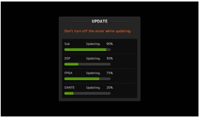 DO NOT OPERATE ANY CONTROL OF THE CONSOLE (SWITCHES, KNOBS, FADERS, ETC.) WHILE UPDATING THE FIRMWARE. DM3/DM3S firmware are transferred