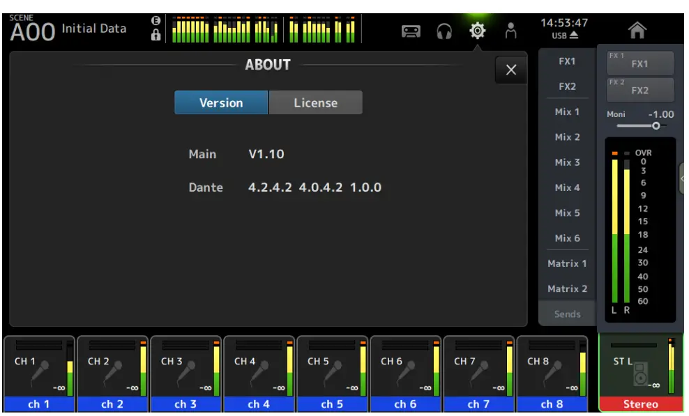 NOTE – With DM3 (with Dante module), when the ABOUT screen is displayed immediately after updating, the Dante version may be displayed as “—— ——- —–“. The version of Dante will be displayed after about 1 minute. If the Dante version is not displayed, see “If the Dante module update failed” (page 7).