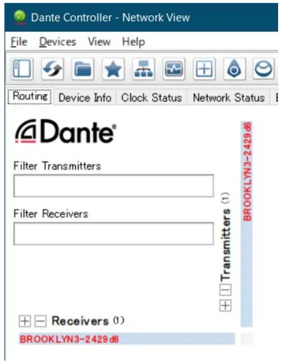 Confirming the Dante module firmware corruption If the Dante module firmware is corrupt, the Dante version is displayed as “—— ——- —–” in the ABOUT screen of the DM3. When the Dante module is booted in the failsafe mode, the Dante module in failsafe mode is shown as “BROOKLYN3-xxxxxx” with red text in the network grid view of Dante Controller. In this case, use the Dante Updater that comes with Dante Controller to restore the Dante module and import and update the latest Dante firmware. For details, refer to “Fail-Safe Mode” in the Dante Firmware Update Guide (yamaha.com).