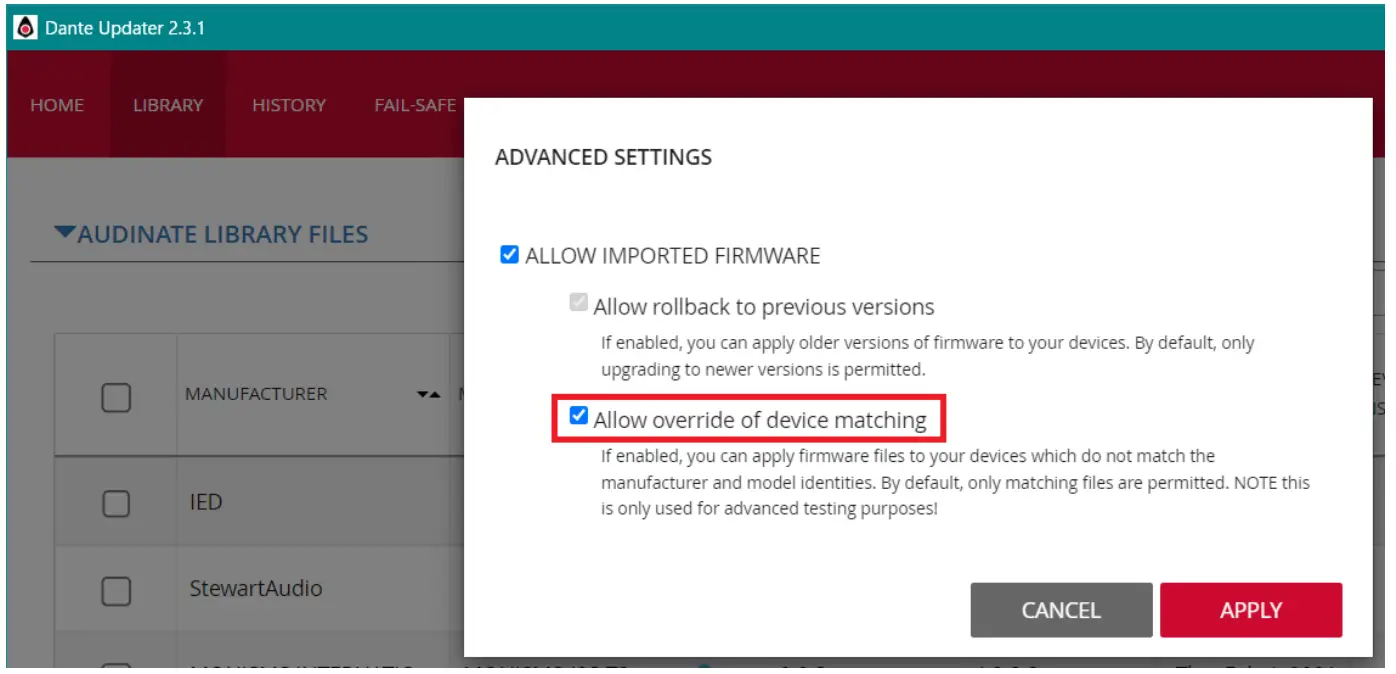 - Execute the Dante Updater to update the Dante module firmware. In this recovery procedure, make sure that “Allow override of device matching” is checked. For details, refer to “Updating the Firmware” in the Dante Firmware Update Guide (yamaha.com).