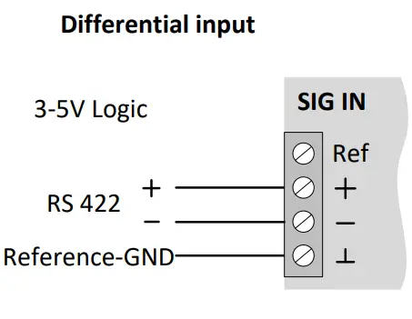 | ❺ | SIG IN | Voltage signal input 2-24V, potential against GND, inverted (-) resp. none- inverted (+),or differential connection (RS422) Ref.: Out 2.5VDC, used to define the unused input (+ or -) |