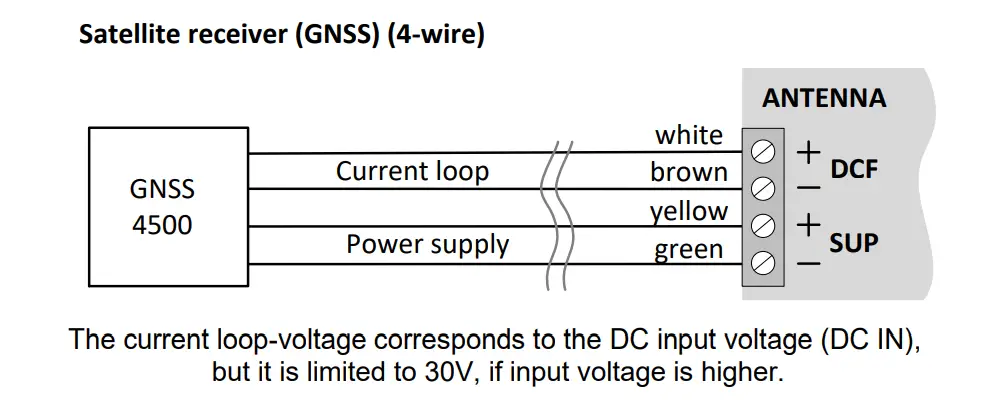 | ❹ | DCF ANT | DCF input, active current loop input. For the connection of a GNSS receiver (with DCF current loop out) or any other DCF source. 30V / 30mA, current limited, min signal level: approx. 6 mA |