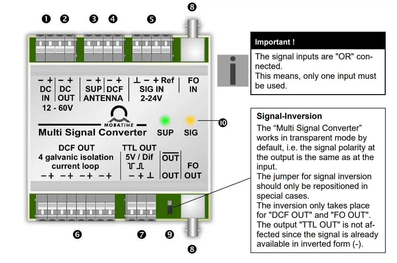 | ❼ | TTL OUT | Signal output 5V, transparent resp. inverted or as RS422 output Signal cascading to next “Multi Signal Converter” |