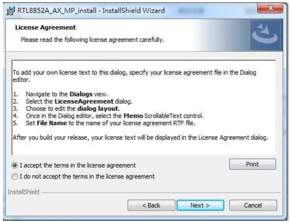 B. Select ”I accept the terms in the license agreement” and click “Next” to process the installation