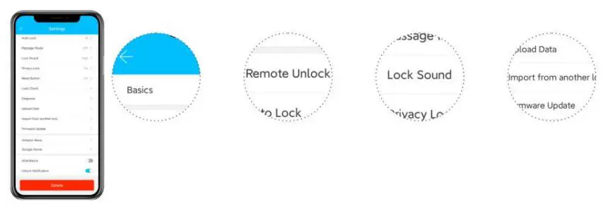 Here are some settings you should familiarize yourself with. Under Basics, you can view and change information such as Lock Name. With Remote Unlock on and a Wifi Gateway connected, you can remotely unlock/lock your lock. Lock Sound adjusts the locks sound level. Import from another lock allows for the transfer of passcodes and fobs from one lock to another. Delete will remove the lock from your account and clear any settings on the lock. You must be near the lock to do this. |