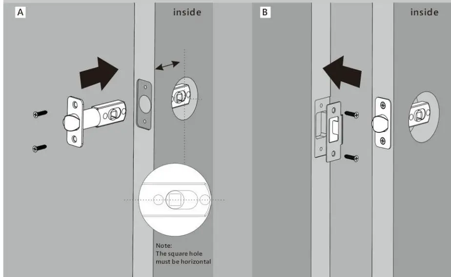 A Hold the latch in front of the door hole, with the latch face flush againstthe door edge.