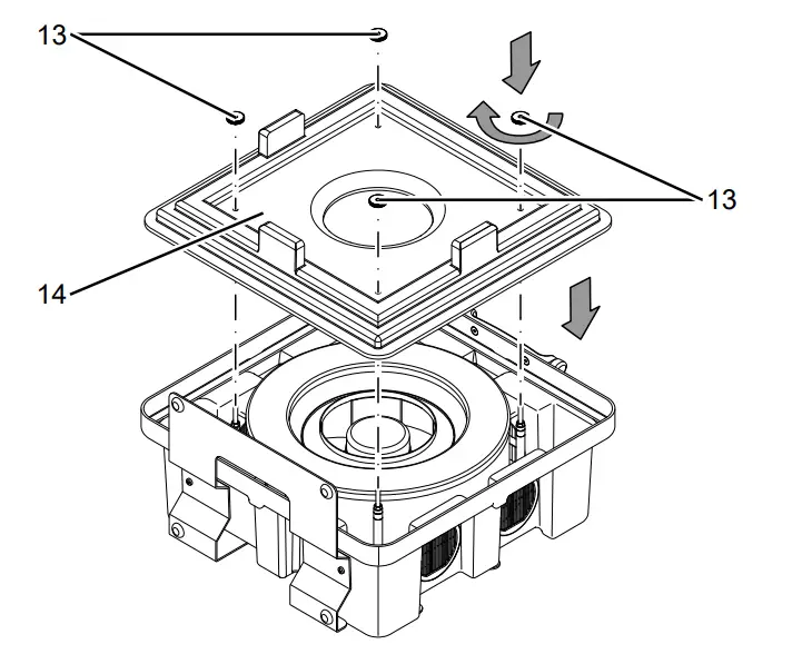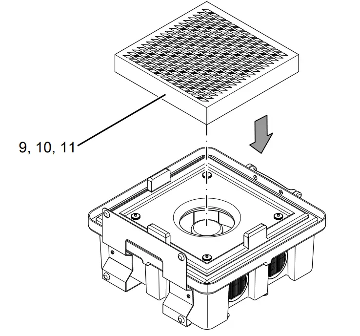- Clean the inside of the device and the filter frame with a soft, damp and lint-free cloth. Make sure that no moisture enters the housing. Protect electrical components from moisture. Do not use any aggressive cleaning agents such as cleaning sprays, solvents, alcohol-based or abrasive cleaners to dampen the cloth.