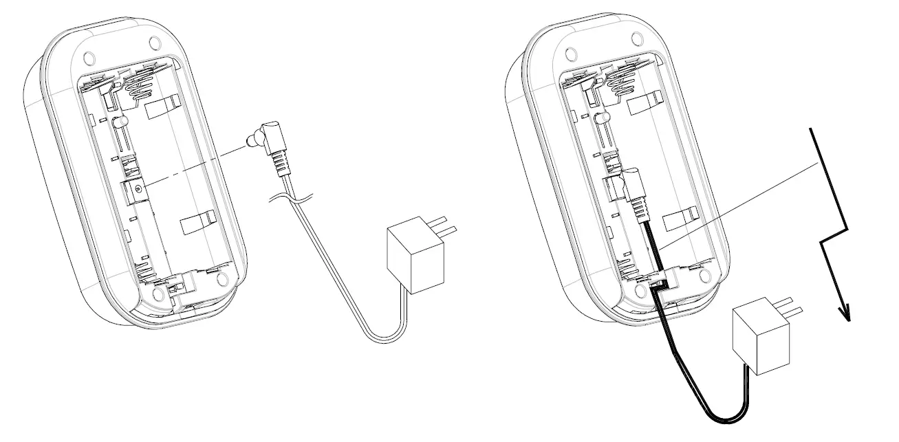 3. You can use power adapter instead of batteries. The power adapter is an optional accessory. A cable track is set inside the unit for you to secure the power adapter. To install the power adapter, connect the plug of power adapter to the DC jack inside the unit. Route the cable along the cable track.