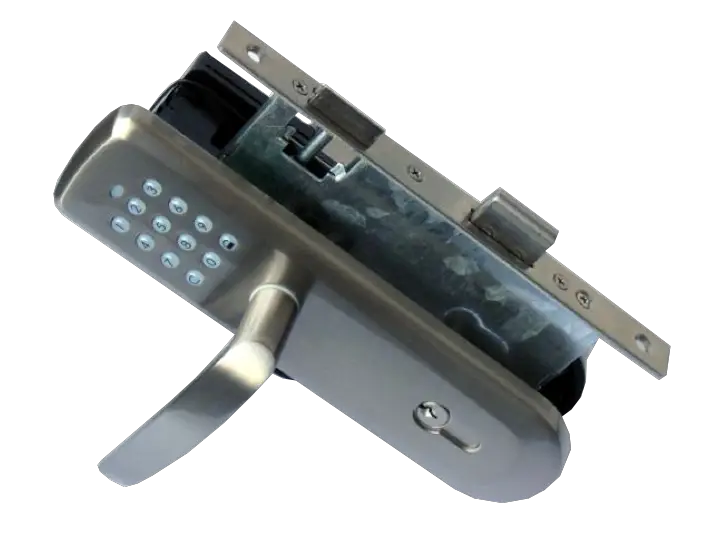 The ZM1702 is a Z-Wave controllable door lock that fits into standard European doors. The mechanics can be adopted to right or left opening doors. The door lock can be applied for doors from a thickness of 38 mm and up. Since the lock is just a single dead bold lock it will not replace modern three dead bold locking outer doors. The door can be locked and unlocked using the inner side turn piece and/or the key pad. The wireless control allows to lock/unlock the lock, set/unset up to 15 different key codes (4…8 key long) and to limit the validity of certain key code.
