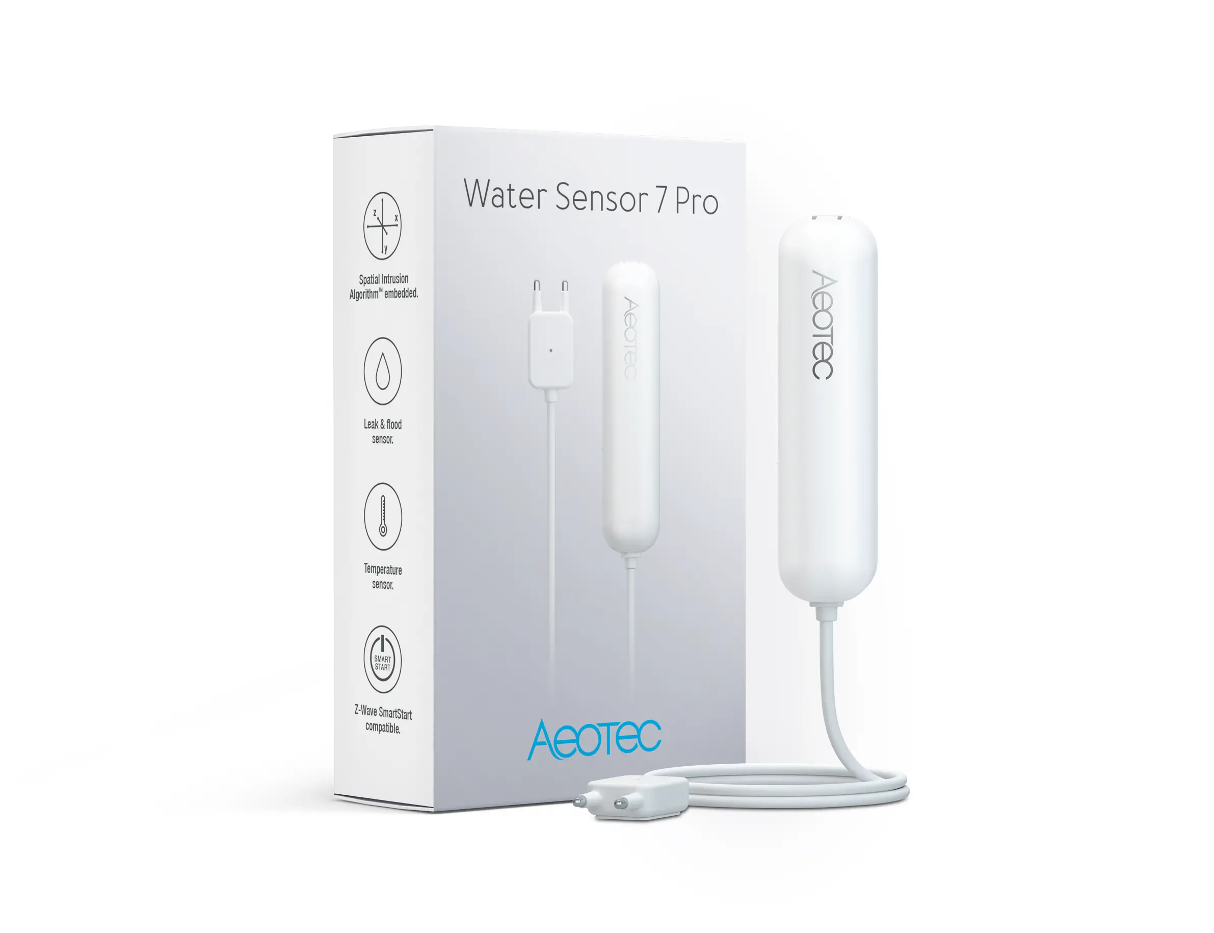 The AEOTEC Water Sensor 7 Pro is a sensor, which detects water leakage, measures temperature and humidity. The sensor is easily retrofittable.