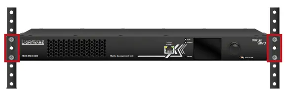 Two rack ears are supplied with the product, which are fixed on left and right side with 8 pcs M4 screws. The default position allows mounting the device as a standard rack unit installation.