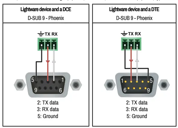 UBEX-MMU-X200 supplied with 3-pole Phoenix connector. See the examples of connecting to a DCE (Data Circuit-terminating Equipment) or a DTE (Data Terminal Equipment) type device: