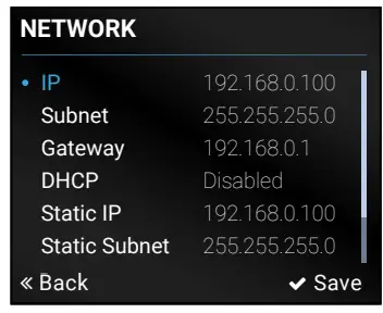 Static Gateway options. Set the parameters by the front panel buttons according to your network requirements. - Navigate to Save (the last one of the Network menu) and press Enter.