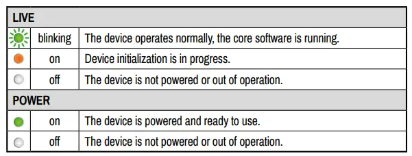 Front panel RJ45 connector for control and firmware upgrade purposes. The port supports 100 Mbps Ethernet connection, auto-negotiation and auto-MDI/MDIX. - Status LEDs The LEDs give immediate feedback about the recent status of the device.