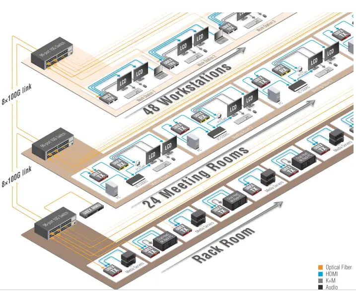 The Matrix mode allows to build almost boundless AV network with countless endpoint installation. This mode requires 10 GbE network with Layer 3 (L3) switch and the