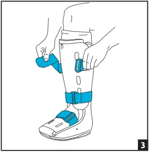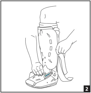Put on sock included with brace. While seated, place leg in brace and seat heel against back. Wrap foot flaps over foot and toe cover around toes (Fig. 1). Secure front panel with lower part inside brace, and upper part outside brace (Fig. 2). Secure straps from bottom to top (Fig. 3). Tighten until snug and comfortable.