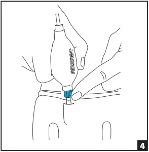 PneumaticWalker aircells are initially deflated. To inflate, firmly insert “inflate” tip of hand bulb into brace valve. Cover hand bulb pressure-relief valve with finger of other hand (Fig. 4). Squeeze hand bulb several times until aircell is snug. With hand bulb still in brace valve, lift finger from pressure-relief valve for 3 to 5 seconds, then withdraw hand bulb. For higher pressure, remove bulb sooner.