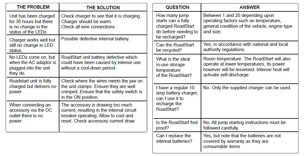 - DO NOT drop or roughly handle the Roadstart – this will break or disjoin the battery terminals rendering the battery useless and the warranty void.
