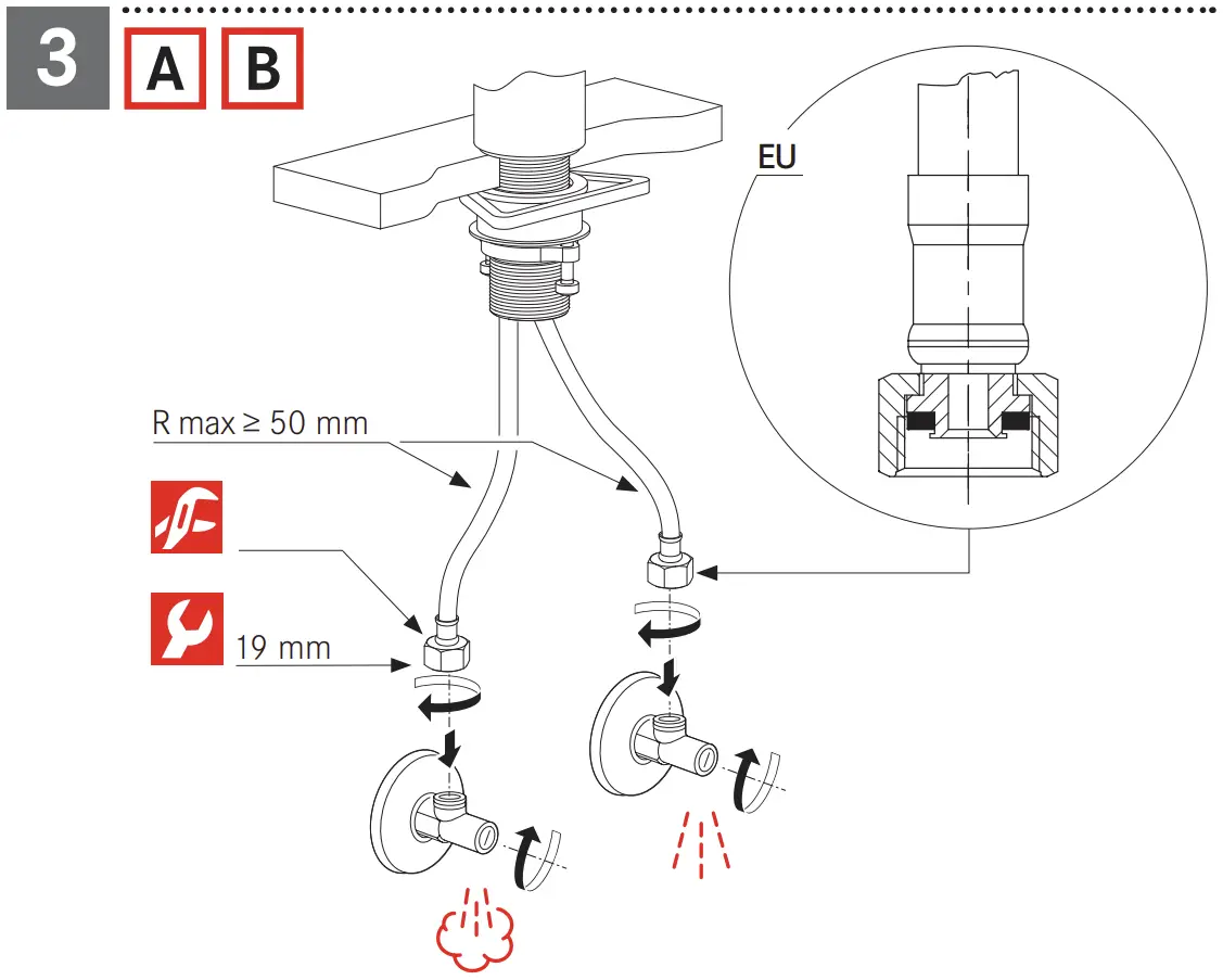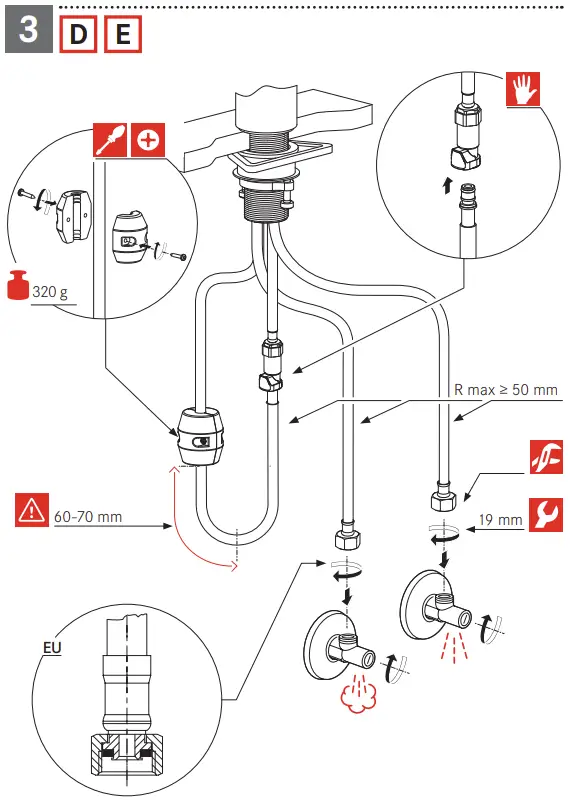 - Don‘t use a wrench or other items to mount the flexibles on the tap side.