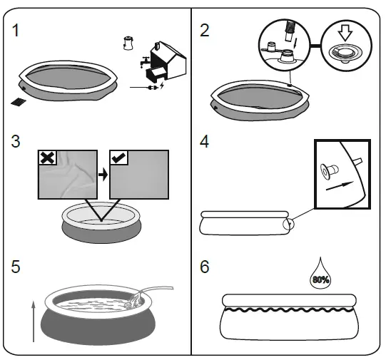 - Fill pool until water capacity is 80%, DO NOT OVERFILL as this could cause the pool to collapse. In times of heavy rainfall you may need to empty some of the water to ensure the level is correct.