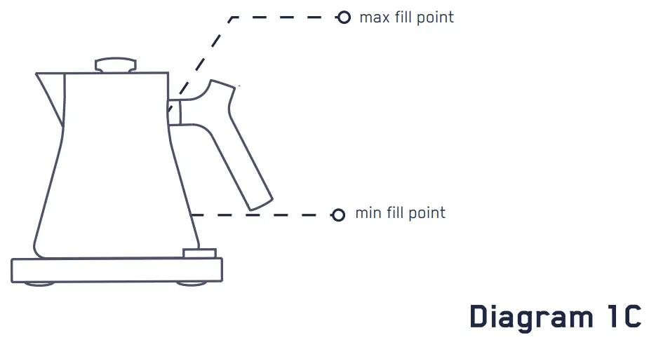- Do not fill above the `max’ fill point as displayed in the diagram below. If the kettle is overfilled, hot water may be ejected. See diagram 1C below for reference. We suggest using only the amount you need to conserve water and energy.