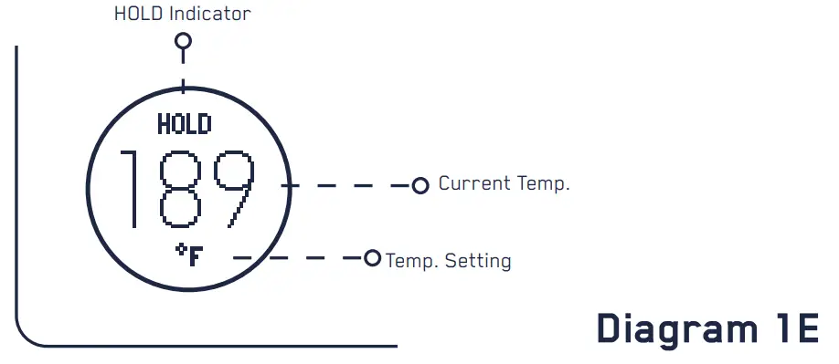 - When Corvo EKG is in hold mode, “HOLD” will appear in the top of the LCD screen when your SET temperature is reached. This indicates that the kettle is in HOLD mode. See diagram 1E for reference.