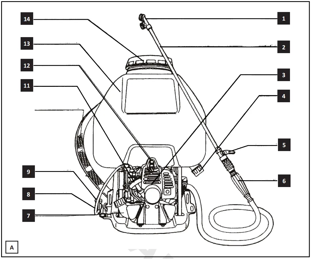 (a): Close tight to seal Dissolve water dispersible power in a separate container before filling. Make sure no strange particles enter into the chemicals. Open the ventilation nozzle, and ventilate until the chemicals are drained out and then close the nozzle tightly. Before spraying the agrochemical, make sure you are equipped with the appropriate protection equipment, to avoid contact and breathing the chemicals. Follow the cautions as shown below for safe operation: