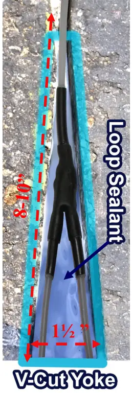 A wider groove is needed for the yoke (area where the loop meets the lead-in). Drop the blade twice to make a “V” cut. The V-cut should be 1½ ” wide at it’s widest point and 8”-10” in length. Before putting the yoke into the V-cut groove, put a layer of sealant down; then place the yoke into the groove and cover with additional sealant. Sealing the yoke this way will fully encapsulate the yoke in sealant and provides an additional layer of protection for your saw-cut loop. Do not bend or crush the yoke area, this could damage the watertight seal.