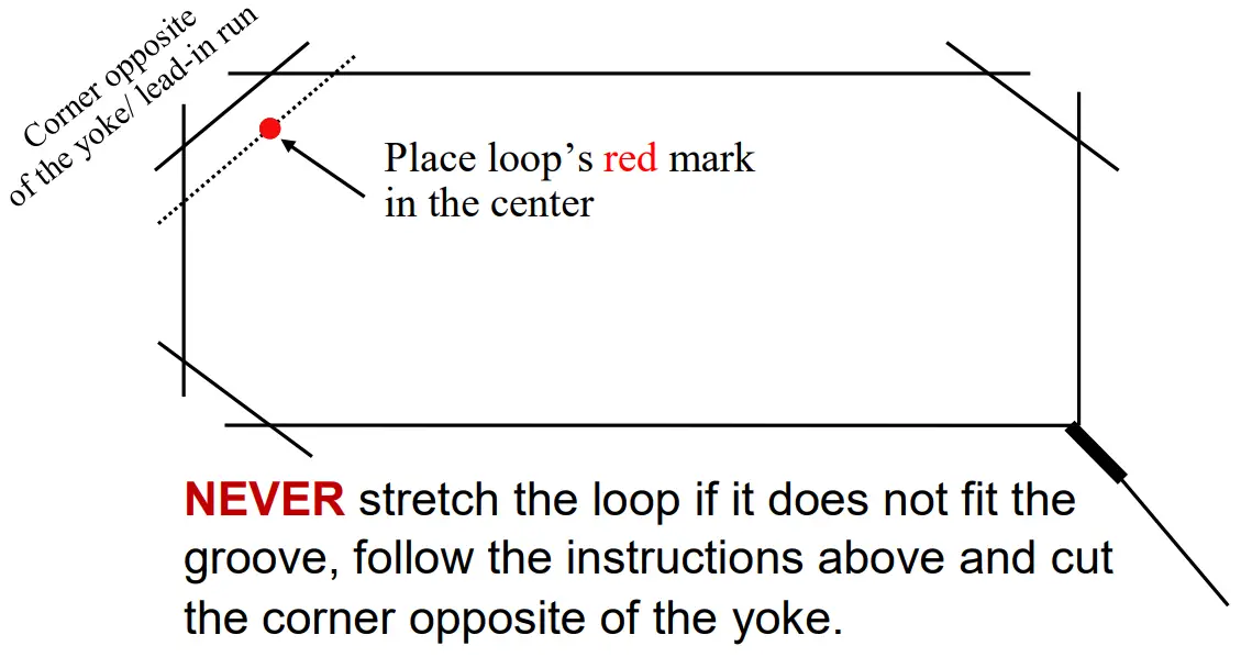 Prepare to insert the loop into the saw-cut groove in this orientation: black wire side up, red wire side down. Start by positioning the red mark on the loop (this mark is made at the factory) at the corner opposite of the yoke/lead-in run. Do not fully insert the loop into the saw-cut groove at this time. Partially insert the loop into the saw-cut groove adjusting the position of the loop to align the yoke into the V-cut. After aligning the yoke start at the red mark (opposite of the yoke) and fully push the loop into the bottom of the saw-cut groove. Do not push the lead-in wire yet! Before pushing the lead-in into the groove put a layer of loop sealant under the yoke (to fully encapsulate the yoke in loop sealant) then place the yoke down and push the lead-in into the groove. Do not use a tool that has a sharp edge to push the loop into the groove. BD Loops recommends the use of its PR3/16” (Pizza Wheel) to push saw-cut loops into the groove.
