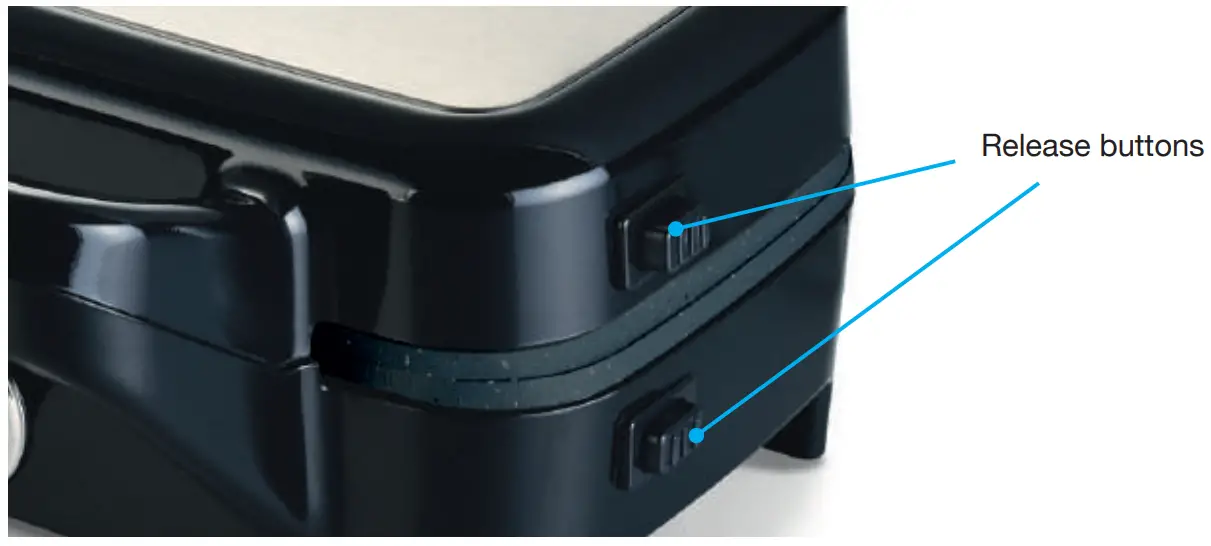To remove the cooking plates, press the buttons on the sides of the appliance to release the cooking plates.