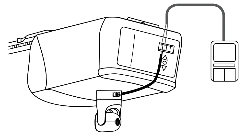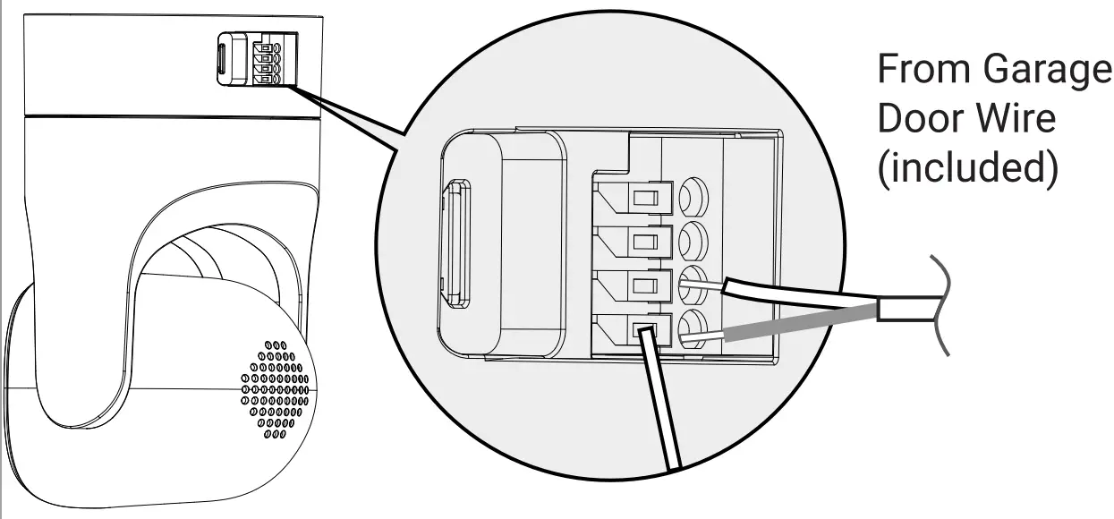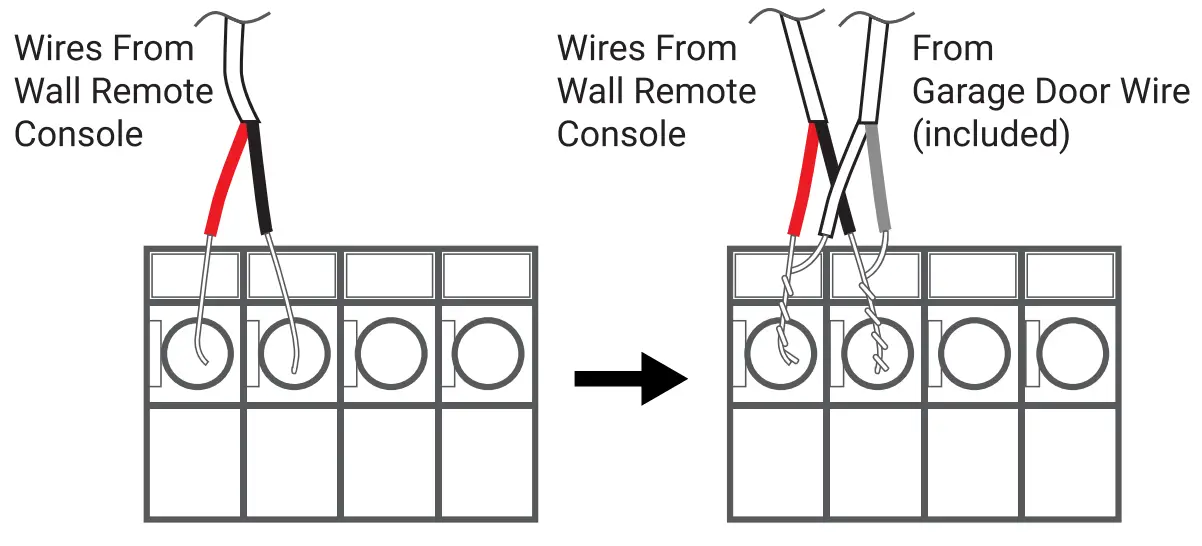 - Connect the garage door wires provided into the same wire ports as your garage wall remote console or button. This may require you to press down on the tabs or loosen screws depending on your garage opener model.