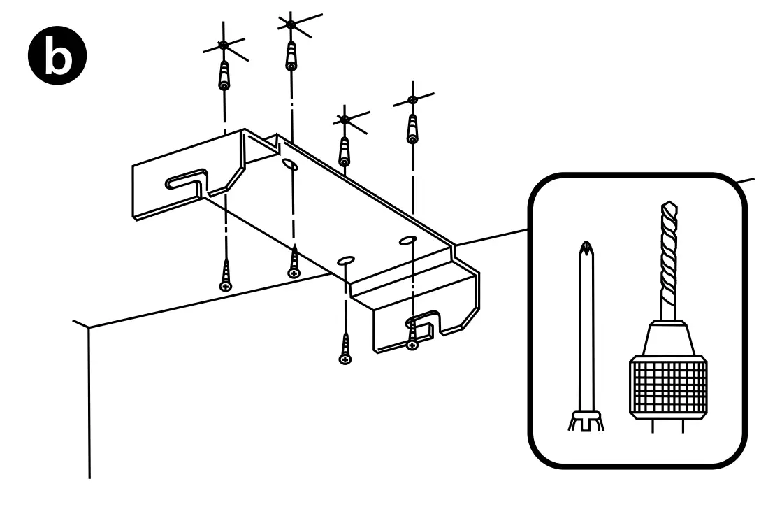 - Drill the holes and fix the bracket with matching fasteners (e.g. dowels), see Fig. b.