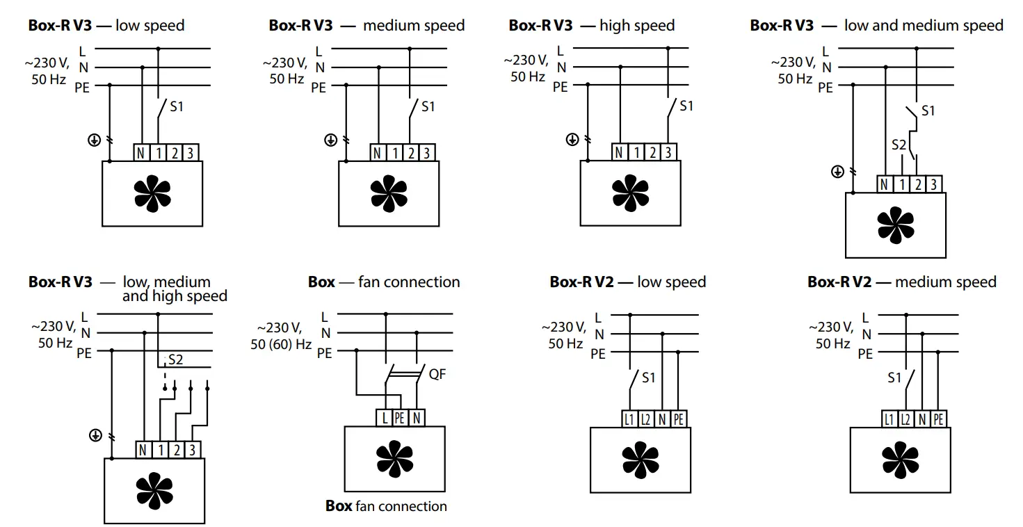 Connect the fan to power mains through the terminal block incorporated inside the terminal box on the fan casing in compliance with the fan wiring diagram.