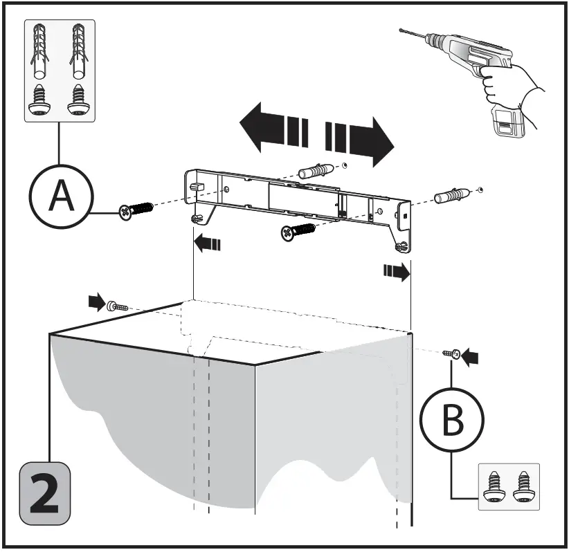 Drill the holes A respecting the distances indicated (Fig.1). Fix the appliance to the wall and align it in horizontal position to the wall units. When the appliance has been adjusted, definitely fix the hood using the screws A (Fig.3). For the various installations use screws and screw anchors suited to the type of wall (e.g. reinforced concrete, plasterboard, etc.). If the screws and screw anchors are provided with the product, check that they are suitable for the type of wall on which the hood is to be fixed.