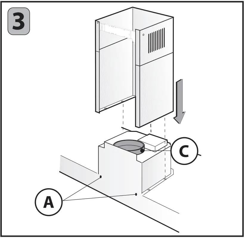 Adjust the width of the support bracket of the upper flue (Fig.2). Then fix it to the ceiling using the screws A (Fig.3) in such a way that it is in line with your hood and respecting the distance from the ceiling indicated in Fig.1. Connect the flange C to the air exhaust hole using a connection pipe (Fig. 3). Insert the upper flue into the lower flue. Fix the lower flue to the hood using the screws B provided (Fig.3), extract the upper flue up to the bracket and fix it with the screws B (Fig.2).
