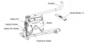Figure 14 - Press handle down, and while at this position, pull safety pin out. Place safety pin into pin holder. Replace protective shield as shown. Tighten four screws. Cutter is ready for use. (See Figure 15)
