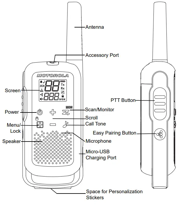 | •8 PMR Channels. •121 Sub-Codes (38 CTCSS Codes & 83 DCS codes) •Up to 8 km Range* •iVOX/VOX •Easy Pairing •20 Selectable Call Tone Alerts •Backlit LCD Display •Roger Tone •Micro USB Connector for charging •Battery Level Meter •Channel Monitor •Channel Scan | •Dual Channel Monitor •Keypad Lock •Auto Squelch Control •Auto Repeat (Scrolling) •Battery Low Alert •Keypad Tone (On/Off) •Power Source: NiMH battery Pack/3 x AA Alkaline batteries •Battery Life: 16 Hours (under typical use conditions) |