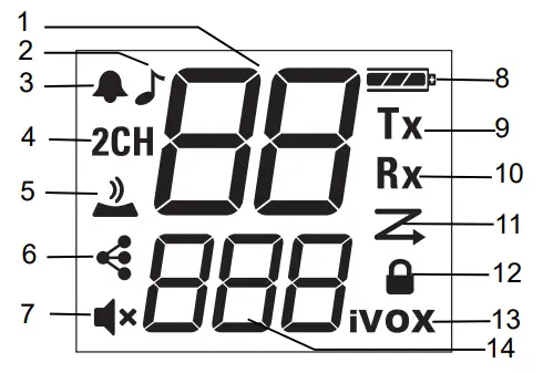 | 1.Channel [1–8] 2. Call Tone [Off, 1–20] 3.Roger Tone [On/Off] 4. Dual Channel Monitor 5.Keypad Tone [On/Off] 6. Easy Pairing 7.Speaker Volume [0–7] 8.Battery Indicator [3 Battery Levels] | 9. Status [Transmit] 10. Status [Receive] 11. Scan Indicator 12. Keypad Lock 13.iVOX [Off, L1, L2, L3] VOX [Off, L1, L2, L3] 14. Sub-Code [0–121] |