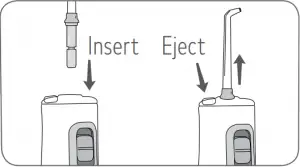 Insert tip into the center of the knob at the top of the Water Flosser handle. The colored ring will be flush with the end of the knob if the tip is correctly locked into place. To remove the tip from the handle, press the tip eject button and pull tip from handle.