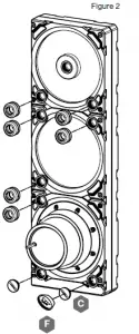 - Close the remaining open (unused) ports with the included CORSAIR G1/4 plugs (C) and tighten them using a Plug Tool (F). Refrain from using a screwdriver as it may result in damage to the surface of the plugs!