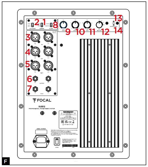 This zone is dedicated to controlling the “high-pass” crossover of the loudspeakers linked with the Sub12 when in 2.1 configuration. The 45Hz/60Hz/90Hz switch is used to select a cut-off frequency, so as to optimise the coupling of the latter with the Sub12 subwoofer.