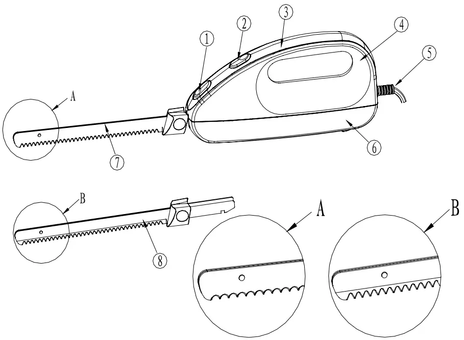 - Keep hands, hair, clothing and other utensils away from foods during operation to reduce the risk of injury to persons, and/or damaged to the Electric Knife.