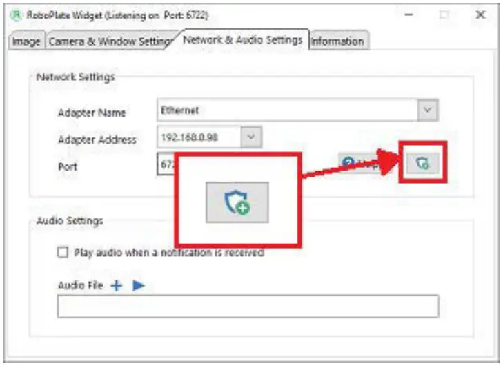 - Go to Network & Audio Settings then select the “Firewall” button to add and allow the connection from the camera to the PC.