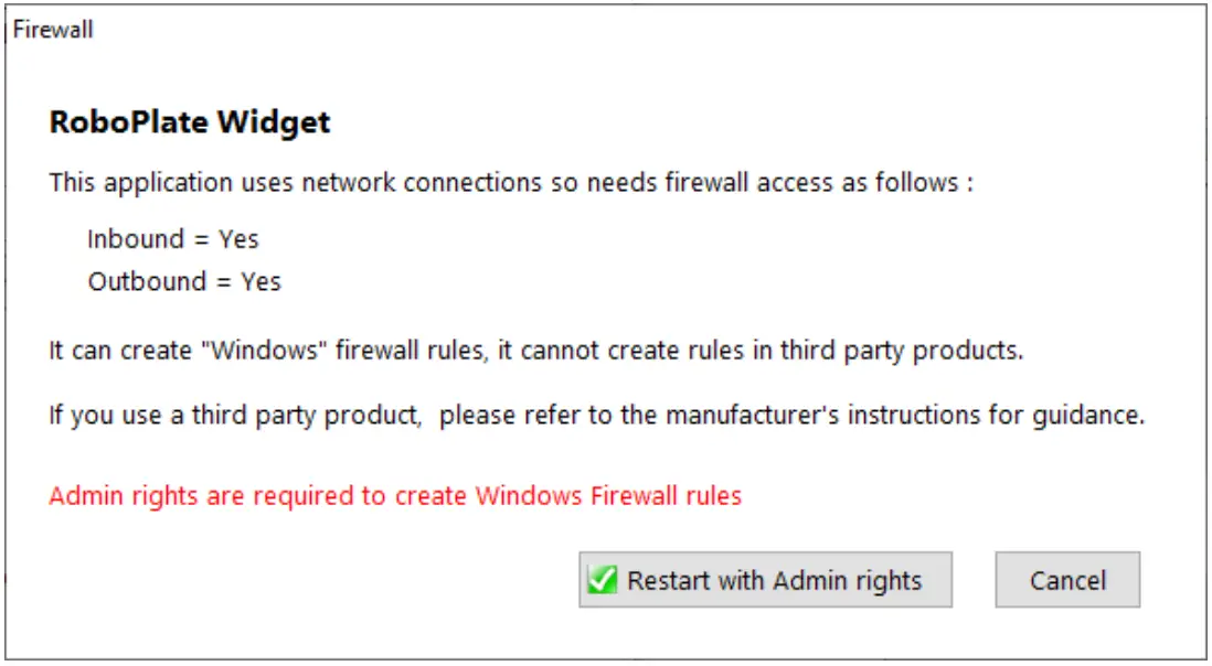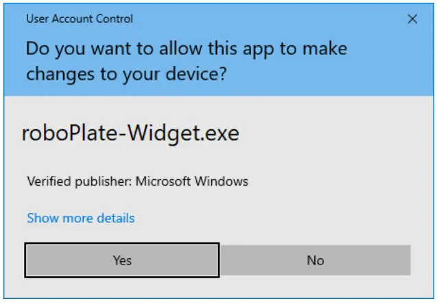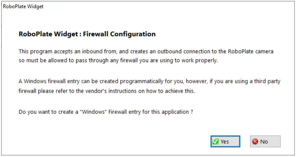 - Select “Yes” for the RoboPlate application to apply an inbound firewall exception, and wait for the dialogue box to disappear.